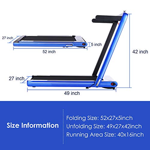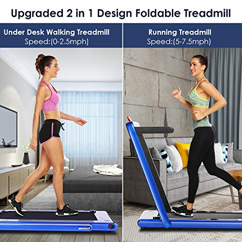★ No need to assemble & Space Saver Design – This 2 in 1 treadmill arrives fully assembled and can be used directly after unboxing. The foldable design and transportation wheels allow for easy mobility and portable foldable treadmill for storage, fold it up and walk away-in one easy step, perfect for home, apartment, office use. Sturdy steel frame, durable to use; support maximum weight up to 220lb.