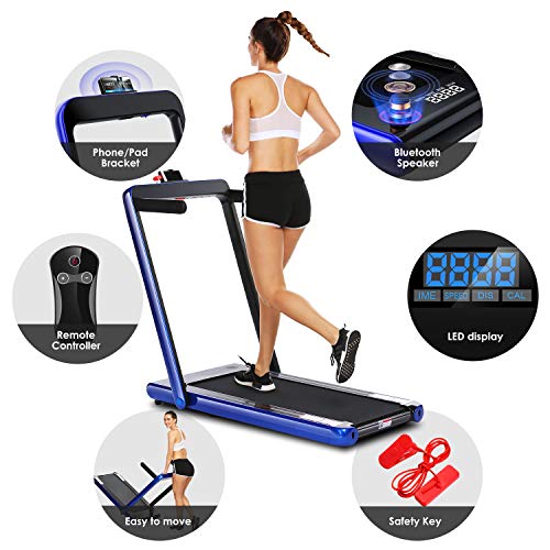 ★ Multi-function LED display & Bluetooth Audio Speaker & Remote Controller – Multi-functional LED display that allows users to track progress in speed, distance, time and calories burned. Built-in Bluetooth speaker and phone bracket, you can listen to music or watch TV when walking or running. You can also change speed or stop in an instant with the remote controller. With the easy-to-reach safety key, the treadmill can moment to stop in emergency situations.
