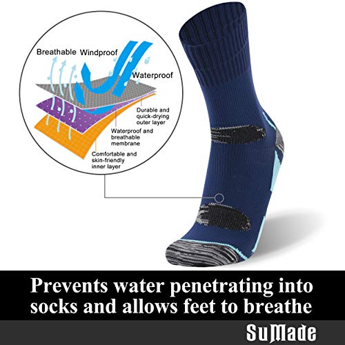 Waterproof & Breathable- Our waterproof crew socks feature 100% waterproof and breathable membrane, which can effectively prevent water penetrating into our lining area and keep our feet dry. Moisture-wicking coolmax inner keeps our feet away from sweated. High quality nylon make our 100% waterproof socks more durable and sturdier.